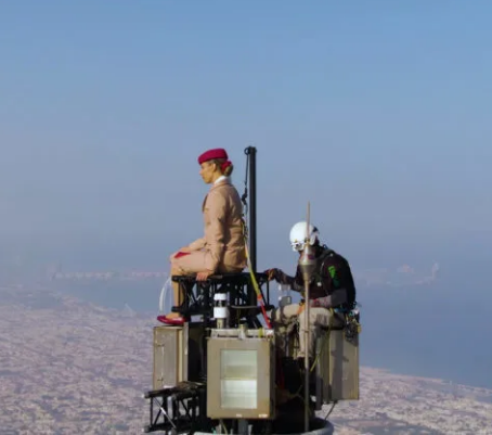 摄制组和这名女特技演员在峰顶上待了大约5个小时,她穿着阿联酋航空公司的制服,佩戴防坠器,系在一个直接连接在峰顶上的特制平台上。一架无人机被用来捕捉连续的镜头,拍摄完整的序列,可谓是惊为天人。
