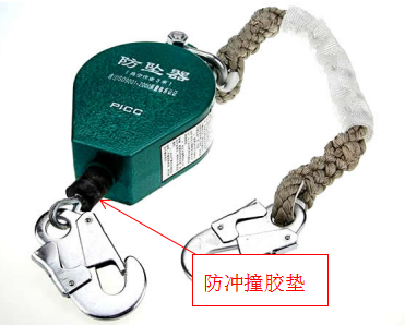 防坠器由拉力勾、罩壳、钢丝绳以及内部自锁系统组成。但仔细观察还会发现,在罩壳的出绳口处有一个长约两厘米的黑色胶垫,这就是防冲撞胶垫。别看它个头小,却发挥着极大的作用。